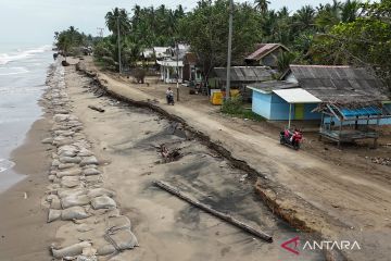 Foto udara pengendara sepeda motor melintas di atas badan jalan yang amblas tergerus abrasi pantai di Desa Lhok Puuk, Seunudon, Aceh Utara, Aceh, Sabtu (8/11/2025). Abrasi pantai akibat air pasang dan gelombang tinggi yang terjadi sejak Rabu (5/11/2025) merusak garis pantai dan ruas jalan lintas antardesa sepanjang 1,5 kilometer, serta mengancam ratusan rumah warga. ANTARA FOTO/Syifa Yulinnas/bar