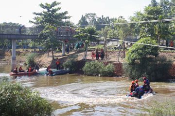 Sejumlah tim penyelamat gabungan dari BPBD DKI Jakarta, TNI dan Polri bersiap melakukan evakuasi korban terseret arus banjir saat pelaksanaan Apel dan simulasi Jaga Jakarta menghadapi musim penghujan 2025 - 2026 di Lebak Bulus, Jakarta, Selasa (4/11/2025). Pemrov DKI Jakarta bersama Badan Penanggulangan Bencana Daerah (BPBD) DKI Jakarta, TNI dan Polri melaksanakan simulasi untuk mendapatkan solusi berbasis alam dalam mengatasi persoalan banjir Jakarta. ANTARA FOTO/Muhammad Iqbal/foc.