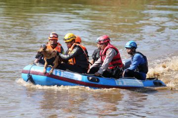 Sejumlah tim penyelamat gabungan dari BPBD DKI Jakarta, TNI dan Polri dan seekor anjing pelacak melakukan pencarian korban yang terseret arus banjir saat pelaksanaan apel dan simulasi Jaga Jakarta menghadapi musim penghujan 2025 - 2026 di Lebak Bulus, Jakarta, Selasa (4/11/2025). Pemrov DKI Jakarta bersama Badan Penanggulangan Bencana Daerah (BPBD) DKI Jakarta, TNI dan Polri melaksanakan simulasi untuk mendapatkan solusi berbasis alam dalam mengatasi persoalan banjir Jakarta. ANTARA FOTO/Muhammad Iqbal/foc.