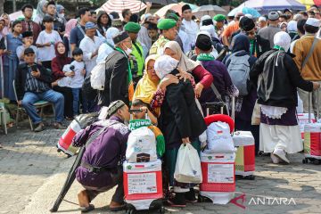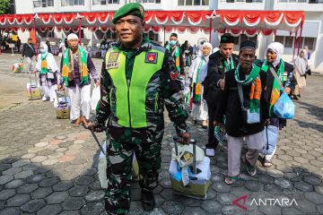 Personel TNI membantu mendorong koper milik jamaah haji setibanya di Debarkasi Islamic Center, Semarang, Jawa Tengah, Sabtu (21/6/2025). Sebanyak 728 orang jamaah haji dan petugas yang tergabung dalam kelompok terbang (kloter) 28, 30, dan 31 Debarkasi Solo (SOC) asal Kota Semarang, Jawa Tengah telah tiba di daerah asal usai melaksanakan ibadah haji 1446 H di Arab Saudi. ANTARA FOTO/Makna Zaezar/agr