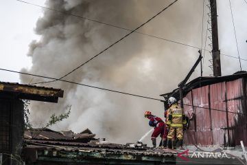 Petugas pemadam kebakaran berusaha memadamkan titik api yang membakar pabrik vulkanisir ban di Genuk, Semarang, Jawa Tengah, Selasa (11/11/2025). Dinas Pemadam Kebakaran Kota Semarang mengerahkan empat unit mobil pemadam kebakaran untuk memadamkan api yang terjadi sejak pukul 08.30 WIB, sementara penyebab kebakaran masih dalam proses penyelidikan pihak berwenang. ANTARA FOTO/Aprillio Akbar/bar