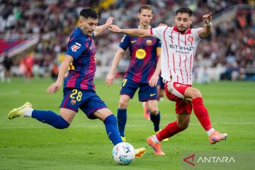 Pesepak bola Barcelona Roony Bardghji (kiri) berusaha menendang bola dibayangi pesepak bola Girona Alex Moreno (kanan) saat pertandingan sepak bola Liga Spanyol antara Barcelona melawan Girona di Stadion Olimpic Lluis Companys, Barcelona, Spanyol, Sabtu (18/10/2025). Barcelona menang atas Girona dengan skor 2-1. ANTARA FOTO/Xinhua/Joan Gosa/agr