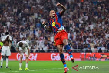 Pemain Barcelona Raphinha berselebrasi usai mencetak gol ke gawang Real Madrid pada final Piala Super Spanyol di King Abdullah Sports City Stadium, Jeddah, Arab Saudi, Senin (12/1/2026). Barcelona juara Piala Super Spanyol usai mengalahkan Madrid 3-2. ANTARA FOTO/REUTERS/Stringer/rwa.