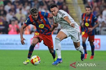 Pemain Real Madrid Kylian Mbappe berebut bola dengan pemain Barcelona Lamine Yamal pada final Piala Super Spanyol di King Abdullah Sports City Stadium, Jeddah, Arab Saudi, Senin (12/1/2026). Barcelona juara Piala Super Spanyol usai mengalahkan Madrid 3-2. ANTARA FOTO/REUTERS/Stringer/rwa.