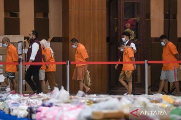 Petugas menggiring sejumlah tersangka kasus narkoba usai dihadirkan saat konferensi pers pengungkapan kasus narkoba di Aula Mabes Polri, Jakarta, Rabu (22/10/2025). Bareskrim Polri melalui Direktorat Tindak Pidana Narkoba mengungkap sebanyak 38.934 kasus penyalahgunaan narkoba pada periode Januari - Oktober 2025 dengan barang bukti di antaranya 6,95 ton sabu, 184,64 ton ganja, 6,83 heroin dan 1.458.078 butir ekstasi dari 51.763 tersangka baik WNI maupun WNA. ANTARA FOTO/Muhammad Adimaja/YU