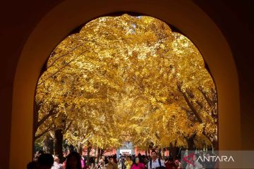 Wisatawan berfoto dengan latar daun pohon ginkgo yang berubah warna menjadi kuning saat musim gugur di taman Zhongshan, Beijing, China, Selasa (11/11/2025). Waktu terbaik untuk menikmati warna kuning cerah dari pohon ginkgo di taman tersebut pada akhir Oktober hingga pertengahan November sebelum daun-daun berguguran saat memasuki musim dingin. ANTARA FOTO/Desca Lidya Natalia/YU