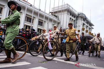 Peserta menggunakan kostum pejuang saat mengikuti karnaval Asia Afrika Festival 2025 di Jalan Asia Afrika, Bandung, Jawa Barat, Sabtu (18/10/2025). Karnaval yang diikuti sejumlah perwakilan kabupaten/kota di Indonesia serta delegasi luar negeri itu merupakan wujud menjadikan Kota Bandung sebagai magnet wisata budaya sekaligus menegaskan sebagai kota diplomasi dunia yang menjaga semangat persaudaraan antarbangsa Asia dan Afrika untuk diwariskan bagi generasi muda. ANTARA FOTO/Novrian Arbi/nz
