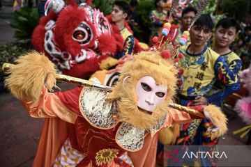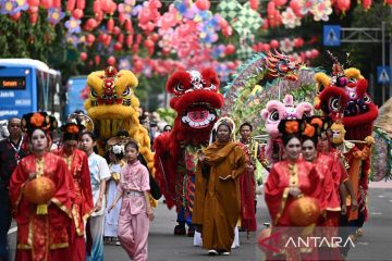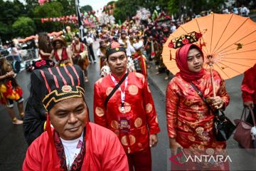 Peserta mengikuti Parade Imlek Nusantara di kawasan Lapangan Banteng, Jakarta, Sabtu (28/2/2026). Parade yang menampilkan naga liong, barongsai, bedug hingga ondel-ondel tersebut merupakan rangkaian Festival Harmoni Imlek Nusantara 2026 sebagai ajang perayaan akulturasi budaya Tionghoa-Nusantara guna memperkuat harmoni kebinekaan di Indonesia. ANTARA FOTO/Fauzan/tom.
