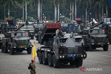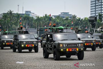 Prajurit Korps Marinir TNI AL dengan alutsista melakukan defile saat gladi bersih Hari Ulang Tahun (HUT) ke-80 Tentara Nasional Indonesia (TNI) di Monas, Jakarta, Jumat (3/10/2025). Gladi bersih tersebut digelar dalam rangka persiapan HUT ke-80 TNI yang mengerahkan sekitar 140 ribu pasukan TNI pada Minggu, 5 Oktober 2025. ANTARA FOTO/Fauzan/nz