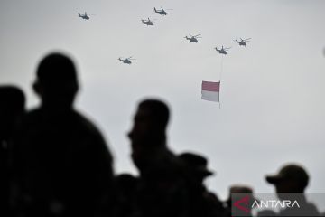 Helikopter Caracal TNI AU mengibarkan Bendera Merah Putih saat gladi bersih Hari Ulang Tahun (HUT) ke-80 Tentara Nasional Indonesia (TNI) di Monas, Jakarta, Jumat (3/10/2025). Gladi bersih tersebut digelar dalam rangka persiapan HUT ke-80 TNI yang mengerahkan sekitar 140 ribu pasukan TNI pada Minggu, 5 Oktober 2025. ANTARA FOTO/Fauzan/nz