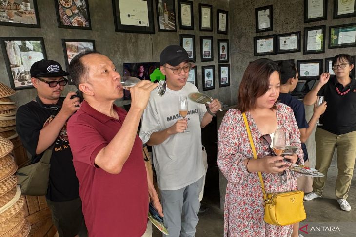 Wisatawan mencoba wine lokal dari Hatten Wines Vineyard melalui sesi wine-tasting di Bali pada Selasa (9/11/2025). (ANTARA/Hreeloita Dharma Shanti)Baca juga: Pasukan bebek jadi prajurit kebun anggur di Afrika Selatan