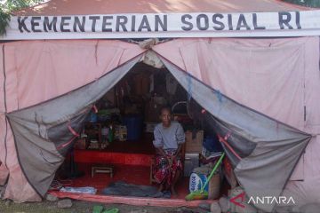Pengungsi bencana erupsi Gunung Lewotobi Laki-laki duduk di dalam tenda pengungsian Pos Lapangan Konga, Desa Konga, Flores Timur, Nusa Tenggara Timur, Rabu (22/10/2025). Sebanyak 1.229 warga penyintas bencana erupsi Gunung Lewotobi Laki-laki bertahan di tenda-tenda pengungsian selama hampir setahun terakhir di tiga titik karena pembangunan hunian sementara untuk mereka belum kunjung tuntas sehingga mereka belum bisa direlokasi ke tempat yang lebih layak. ANTARA FOTO/Mega Tokan/YU