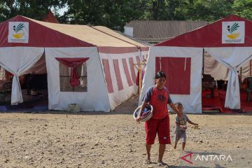 Pengungsi bencana erupsi Gunung Lewotobi Laki-laki berjalan di depan tenda pengungsian Pos Lapangan Konga, Desa Konga, Flores Timur, Nusa Tenggara Timur, Rabu (22/10/2025). Sebanyak 1.229 warga penyintas bencana erupsi Gunung Lewotobi Laki-laki bertahan di tenda-tenda pengungsian selama hampir setahun terakhir di tiga titik karena pembangunan hunian sementara untuk mereka belum kunjung tuntas sehingga mereka belum bisa direlokasi ke tempat yang lebih layak. ANTARA FOTO/Mega Tokan/YU