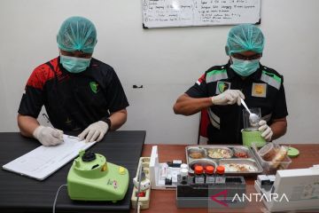 Petugas keamanan pangan (food safety) Biddokkes Polda Sulawesi Selatan mengambil sampel menu program Makan Bergizi Gratis (MBG) untuk diperiksa di Satuan Pelayanan Pemenuhan Gizi (SPPG) Polda Sulsel di Kecamatan Biringkanaya, Makassar, Sulawesi Selatan, Jumat (7/11/2025). Uji kualitas menggunakan metode organoleptik dan analisis kimia tersebut dilakukan setiap hari untuk memastikan menu MBG yang diproduksi di dapur SPPG itu layak dikonsumsi sebelum disalurkan ke para siswa di 16 sekolah di wilayah setempat. ANTARA FOTO/Arnas Padda/tom.