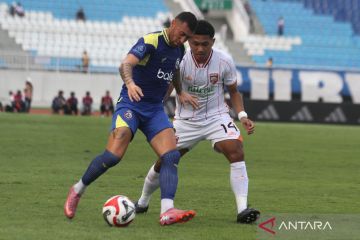 Pesepak bola Borneo FC Mariano Ezequiel Peralta Bauer (kanan) melakukan selebrasi bersama rekannya Maicon De Souza Da Silva (kiri) usai mencetak gol di gawang Arema FC dalam pertandingan BRI Super League 2025 di Stadion Kanjuruhan, Malang, Jawa Timur, Minggu (26/10/2025). Borneo FC mengalahkan Arema FC dengan skor 3-1. ANTARA FOTO/Ari Bowo Sucipto/nz