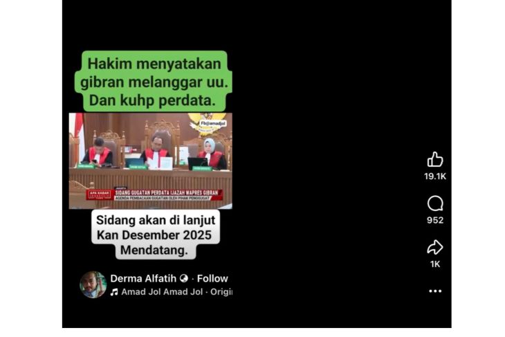Unggahan itu juga menyebut bahwa sidang akan dilanjutkan pada Desember 2025. Video tersebut mendapat perhatian luas, ditonton ratusan ribu kali, disukai lebih dari 19 ribu pengguna, serta memperoleh hampir seribu komentar dan seribu kali dibagikan.