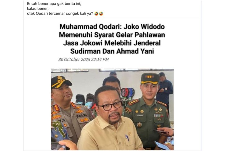 Jakarta (ANTARA/JACX) – Sebuah unggahan di Facebook menampilkan tangkapan layar artikel yang menyebut Kepala Staf Kepresidenan, Muhammad Qodari, menyarankan agar Joko Widodo diangkat sebagai pahlawan nasional karena dianggap memiliki jasa yang melebihi Jenderal Sudirman dan Ahmad Yani.