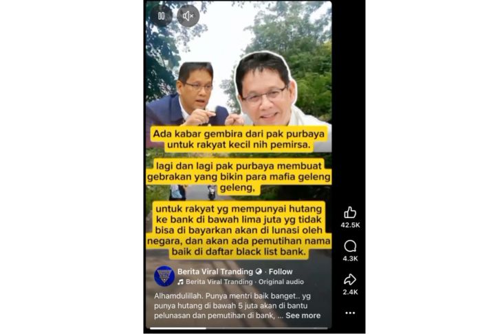 “Ada kabar bahwa Purbaya memberikan bantuan untuk masyarakat kecil. Disebutkan bahwa bagi rakyat yang memiliki utang ke bank di bawah lima juta rupiah dan tidak mampu membayarnya, utang tersebut akan dilunasi oleh negara. Selain itu, akan ada pemutihan nama bagi mereka yang sebelumnya masuk daftar hitam bank.”