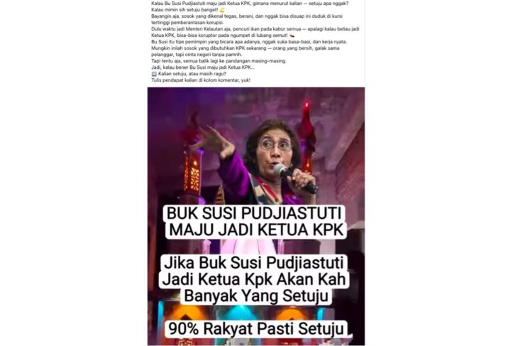 Konten itu juga disertai narasi tambahan yang menggambarkan Susi Pudjiastuti sebagai sosok tegas, berani, dan antisuap, serta dianggap cocok memimpin KPK.