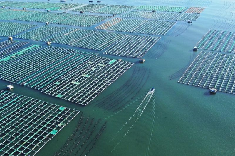 Foto dari udara yang diabadikan menggunakan drone pada 13 September 2025 menunjukkan area pengembangbiakan keramba jaring apung ekologis di Kota Rongcheng, Provinsi Shandong, China timur. (Xinhua/Li Xinjun)