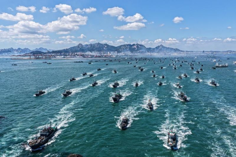 Foto dari udara yang diabadikan menggunakan drone pada 1 September 2025 ini menunjukkan kapal-kapal penangkap ikan berlayar usai berakhirnya moratorium penangkapan ikan di laut Kuning dan Bohai, di pelabuhan perikanan Shidao di Kota Rongcheng, Provinsi Shandong, China timur. (Xinhua/Li Xinjun)