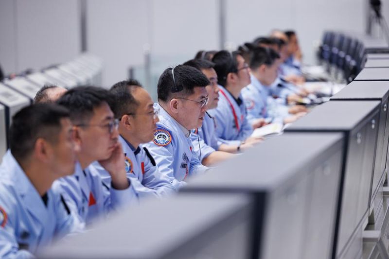 Personel teknis memantau jalannya proses rendezvous and docking wahana antariksa berawak Shenzhou-21 dengan stasiun luar angkasa dari Pusat Kendali Antariksa Beijing (Beijing Aerospace Control Center/BACC) pada 1 November 2025. (ANTARA/Xinhua/Jin Liwang)
