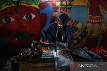 Penjahit menyelesaikan jahitan di kolong jembatan, Jalan Pisangan Lama, Jatinegara, Jakarta, Rabu (8/10/2025). Usaha jasa jahit yang telah ada sejak 1970 itu masih diminati warga setempat dengan pendapatan harian berkisar Rp50 ribu-Rp200 ribu. ANTARA FOTO/Muhammad Rizky Febriansyah/tom.
