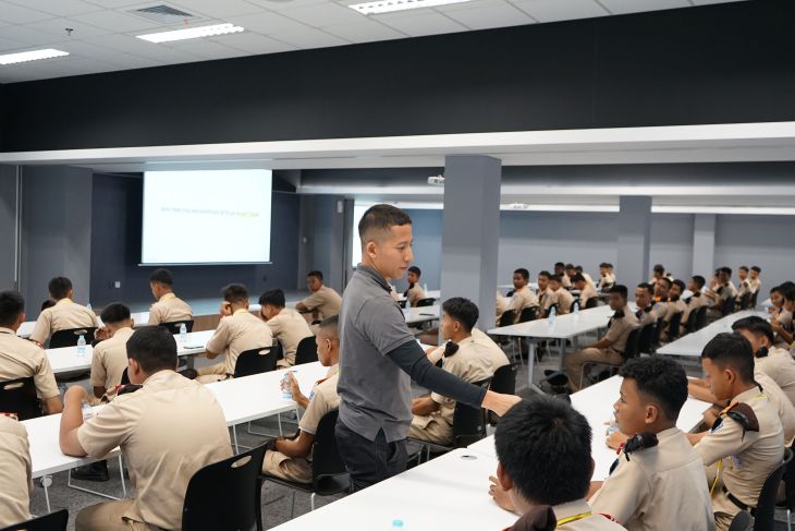 Sesi Motivational Sharing oleh HR Director PT Daimler Commercial Vehicles Indonesia (DCVI) Aditia Putro pada saat kunjungan SMK Angkasa 1 ke Pabrik Truk-Bus Mercedes-Benz di Cikarang, Jawa Barat, Kamis (23/10/2025). (Dok. PT DCVI)