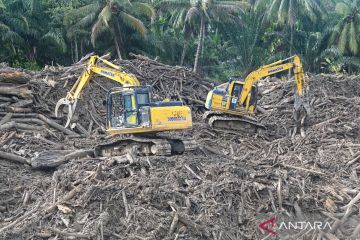 Petugas menggunakan alat berat membersihkan gelondongan kayu yang menutupi aliran sungai Aek Garoga pascabencana banjir bandang dan tanah longsor di Kabupaten Tapanuli Tengah, Sumatera Utara, Kamis (11/12/2025). Sulitnya akses menuju lokasi dan terbatasnya alat berat membuat proses pembersihan gelondongan batang kayu terhambat sehingga menyulitkan proses evakuasi serta pencarian korban bencana banjir bandang. ANTARA FOTO/Muhammad Adimaja/nz