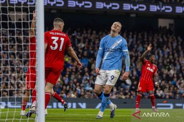 Pesepak bola Manchester City Erling Haaland (kanan) bereaksi setelah gagal memanfaatkan peluang dalam pertandingan Liga Inggris antara Manchester City melawan Nottingham Forest di Manchester, Inggris, Rabu (4/3/2026). Pertandingan tersebut berakhir imbang 2-2. ANTARA FOTO/Xinhua/bar