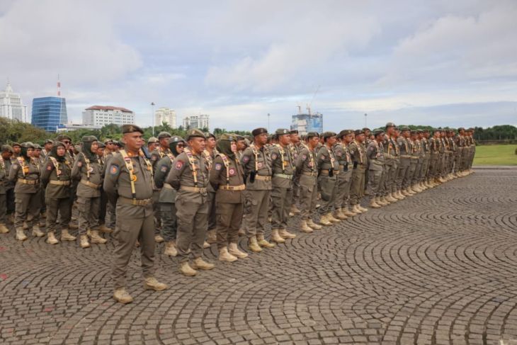 Personel Satuan Polisi Pamong Praja (Satpol PP) saat apel gelar pasukan kesiapan pengamanan menjelang perayaan Natal 2025 dan Tahun Baru 2026 (Nataru), di Monas Sisi Selatan, Jakarta Pusat, Kamis (18/12/2025). (ANTARA/HO-Satpol PP DKI Jakarta.)2.061 personel Satpol PP disiagakan untuk jaga Natal 2025 di Jakarta