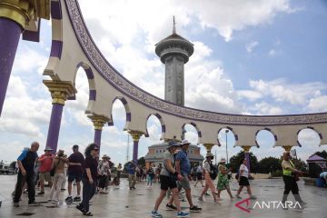 Wisatawan domestik menyapa wisatawan mancanegara saat berkunjung di Masjid Agung Jawa Tengah (MAJT), Semarang, Jawa Tengah, Jumat (16/1/2026). Sebanyak 1.000 lebih wisatawan mancanegara dari kapal pesiar Ocean Regatta dan Ocean Sirena yang berlabuh di Pelabuhan Tanjung Emas tersebut mengunjungi sejumlah obyek wisata unggulan di Kota Semarang seperti MAJT, Sam Poo Kong, Cagar Budaya Nasional Kota Lama dan wisata kuliner untuk mengenal sejarah serta perkembangan budaya khas Indonesia. ANTARA FOTO/Makna Zaezar/nym.