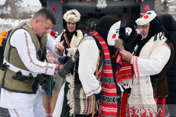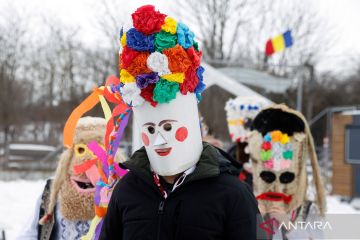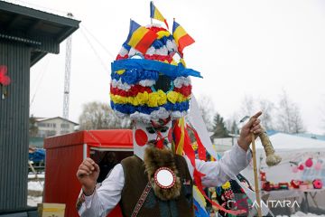 Warga dengan mengenakan topeng berpartisipasi dalam festival tahunan "Cuckoo's Day" di Branesti, Bukares, Rumania, Senin (23/2/2026). Kelompok-kelompok orang yang bertopeng mengambil bagian dalam festival tradisional tersebut dengan bernyanyi dan menari demi kesehatan dan kesuburan guna menyambut awal musim semi. ANTARA FOTO/Xinhua/Cristian Cristel/bar