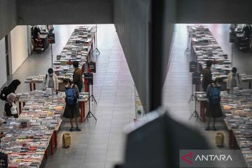 Pengunjung memilih buku saat Jakarta International Literary Festival di Taman Ismail Marzuki, Jakarta, Jumat, (14/11/2025). Festival literasi bertajuk The Homeland in Our Bodies atau Tanah Air dalam Tubuh Kita tersebut menyuguhkan bazar buku dari penerbit independen dan sejumlah kegiatan literasi lainnya yang berlangsung hingga 16 November 2025. ANTARA FOTO/Sulthony Hasanuddin/nym.