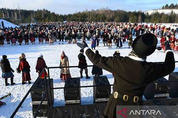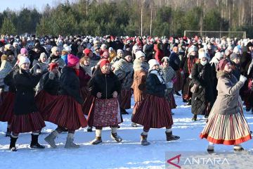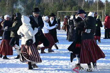 Sejumlah orang mengenakan pakaian tradisional saat ikut serta dalam festival tari musim dingin di Kohtla-Nomme, Estonia, Sabtu (7/2/2026). ANTARA FOTO/Xinhua/Sergei Stepanov/rwa.