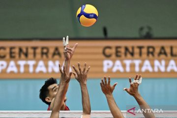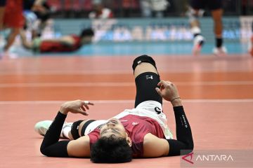 Pevoli Indonesia Boy Arnez Arabi berbaring usai timnya kalah dari tim voli Thailand saat final voli putra SEA Games 2025 di Hua Mak Indoor Stadium Ramkhamhaeng Rd, Hua Mak, Bang Kapi, Bangkok, Thailand, Jumat (19/12/2025). Indonesia meraih medali perak setelah kalah dari Thailand 2-3 (20-25, 25-16, 23-25, 25-23 dan 12-15). ANTARA FOTO/Nova Wahyudi/agr
