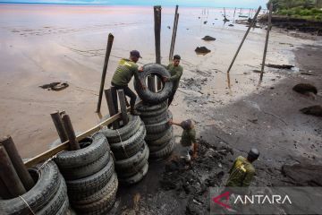 Anggota Kelompok Usaha Bersama (KUB) Mundam Jaya binaan Kilang Pertamina Internasional RU 2 memasang perlengkapan alat pemecah ombak di Mundam, Dumai, Riau, Jumat (17/10/2025). Kilang Pertamina Internasional RU 2 membuat alat pemecah ombak (appostrap) yang terbuat dari ban bekas dan kayu nibung menjadi benteng sebagai pelindung pantai dari ancaman abrasi yang terus menggerus daratan pesisir pantai. ANTARA FOTO/Muhammad Iqbal/tom.