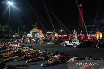 Sejumlah pelakon memerankan perjuangan pemuda Indonesia melawan penjajah dalam drama teatrikal peringatan Pertempuran Lima Hari Semarang (PLHS) di depan Tugu Muda, Semarang, Jawa Tengah, Selasa (14/10/2025). Drama teatrikal dan upacara yang melibatkan 1.900 peserta dari unsur TNI, Polri, Pramuka, Tagana, karang taruna, pelajar SMA/SMK, serta berbagai komunitas seni di kota tersebut mengisahkan tentang PLHS pada Oktober 1945 di kawasan Tugu Muda antara pemuda pejuang melawan tentara Jepang yang menewaskan ratusan orang dari kedua belah pihak. ANTARA FOTO/Makna Zaezar/tom.