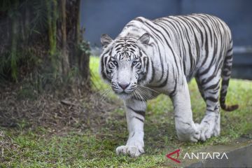 Seekor harimau Benggala (Panthera tigris tigris) jantan bernama Aden Jelatang berjalan di sekitar rumpun bambu dalam kandang Taman Rimbo Zoo saat resmi diperkenalkan untuk umum di Jambi, Rabu (15/10/2025). Taman Rimbo Zoo bersama Pemprov Jambi memperkenalkan kehadiran dua penghuni baru kebun binatang satu-satunya di Provinsi Jambi itu kepada masyarakat pada hari ini, yakni seekor harimau Benggala berumur dua tahun yang didatangkan dari Lembang Park and Zoo dan seekor singa putih Afrika (Panthera leo krugeri) jantan bernama Mara Pijoan berumur empat tahun dari Faunaland Ancol. ANTARA FOTO/Wahdi Septiawan/tom.