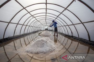 Pekerja memanen garam yang menggunakan teknologi tunnel geomembrane milik Koperasi Produsen Garam Inti Rakyat di Desa Kalianyar, Kabupaten Indramayu, Jawa Barat, Minggu (19/10/2025). Kementerian Kelautan dan Perikanan merancang modeling ekstensifikasi dan intensifikasi kawasan tambak garam di lima lokasi di Indonesia dengan lahan seluas 2.000 hektar untuk mewujudkan swasembada garam pada 2027 dan menciptakan penyerapan tenaga kerja sebanyak 6.000 orang. ANTARA FOTO/Dedhez Anggara/tom.