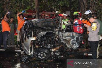 Tim Inafis melakukan olah tempat kejadian perkara (TKP) mobil yang mengalami kecelakaan di Jalan Manyar Kertoarjo, Surabaya, Jawa Timur, Rabu (15/10/2025). Mobil Honda Jazz bernomor polisi L 1361 CBD itu mengalami kecelakaan tunggal dan terbakar yang mengakibatkan pengemudinya berinisial GP dan penumpang RA meninggal di tempat sementara satu penumpang korban selamat mengalami luka berat berinisial MS. ANTARA FOTO/Didik Suhartono/tom.