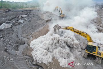 Foto udara petugas dengan bantuan alat berat menyelesaikan pembangunan tanggul yang rusak akibat terdampak erupsi Gunung Semeru di Desa Supiturang, Pronojiwo, Lumajang, Jawa Timur, Selasa (25/11/2025). Pemprov Jawa Timur mengerahkan petugas gabungan beserta 15 alat berat untuk membangun tanggul sepanjang 300 meter dengan tinggi 7 meter serta membuat sodetan sepanjang 500 meter yang ditargetkan rampung dalam 10 hari guna mengantisipasi potensi erupsi dan banjir lahar susulan. ANTARA FOTO/Irfan Sumanjaya/tom.