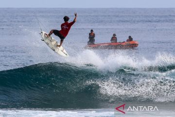 Peselancar Indonesia I Made Pajar Ariyana beraksi pada final Kejuaraan Manokwari Pro World Surf League QS2000 di Pantai Petrus Kafiar Amban, Manokwari, Papua Barat, Minggu (30/11/2025). I Made Pajar Ariyana berhasil menjuarai Mens Pro QS 2000 Manokwari Pro World Surf League QS2000 dengan total skor 17,50 poin. ANTARA FOTO/Chairil Indra/tom.