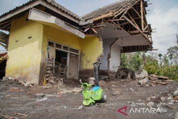 Kondisi rumah yang rusak terdampak erupsi Gunung Semeru di Desa Supiturang, Pronojiwo, Lumajang, Jawa Timur, Senin (24/11/2025). Berdasarkan data BPBD Lumajang per Minggu (23/11) sebanyak 232 rumah dan 105,55 hektare lahan pertanian di wilayah tersebut rusak terdampak erupsi Gunung Semeru. ANTARA FOTO/Irfan Sumanjaya/tom.