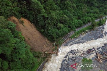Foto udara longsor menimpa jalan di wilayah Mega Mendung, Lembah Anai, Tanah Datar, Sumatera Barat, Sabtu (29/11/2025). Akses utama jalan nasional Padang-Bukittinggi itu putus total akibat banjir bandang dan longsor pada Kamis (27/11) sehingga pengguna jalan harus memutar jauh melalui Kabupaten Solok. ANTARA FOTO/Iggoy el Fitra/tom.