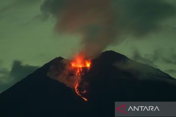 Lava pijar keluar dari kawah Gunung Semeru terlihat dari Kecamatan Pronojiwo, Lumajang, Jawa Timur, Selasa (25/11/2025) dini hari. Berdasarkan laporan Pusat Vulkanologi dan Mitigasi Bencana Geologi (PVMBG) periode pengamatan pukul 00.00â06.00 WIB, gunung itu tercatat mengalami 38 kali gempa letusan, tiga kali gempa guguran, dan tiga kali gempa hembusan sehingga warga diimbau tidak beraktivitas di sektor tenggara sepanjang Besuk Kobokan hingga jarak 20 kilometer dari kawah. ANTARA FOTO/Irfan Sumanjaya/tom.