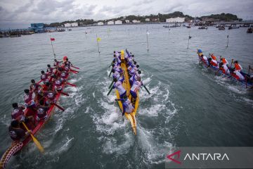 Peserta beradu kecepatan pada penyisihan lomba perahu Batam International Sea Eagle Boat Race 2025 di Dataran Elang-elang Laut Belakang Padang, Batam, Kepulauan Riau, Jumat (28/11/2025). Lomba perahu tradisional yang berlangsung hingga 30 November2025 itu diikuti 21 tim dari Malaysia, Singapura, dan Jawa Barat. ANTARA FOTO/Teguh Prihatna/tom.