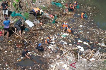 Petugas kebersihan bersama pemerhati lingkungan gotong royong membersihkan sungai dari sampah saat aksi River Clean Up di Desa Batubulan, Gianyar, Bali, Senin (20/10/2025). Kegiatan yang diikuti instansi pemerintah, komunitas lingkungan, dan pemangku kepentingan pariwisata Bali tersebut untuk membersihkan sungai dari sampah di aliran sungai yang merupakan kawasan terdampak banjir bandang pada Rabu (10/9) dan guna melestarikan alam serta mendukung program Gerakan Bali Bersih Sampah. ANTARA FOTO/Nyoman Hendra Wibowo/tom.