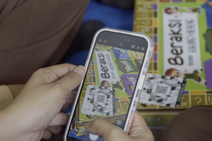 Board game "Beraksi" menggunakan teknologi AR yang tengah dipindai dalam ponsel. (ANTARA/HO-Universitas Telkom)Anggota Tim Pengabdian Masyarakat Universitas Telkom Andi Rimba Manggala Putra juga menyampaikan kepada peserta tentang perbedaan AR dan Virtual Reality (VR).