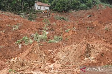 Tim SAR gabungan melakukan proses pencarian korban longsor di Desa Cibeunying, Majenang, Cilacap, Jawa Tengah, Sabtu (15/11/2025). BNPB melanjutkan proses pencarian korban di harı ketiga pada wilayah yang terdampak longsor dengan luasan mencapai 6,5 hektar dan dibagi menjadi sektor A dan B utnuk memudahkan proses pencarian. ANTARA FOTO/Idhad Zakaria/sgd